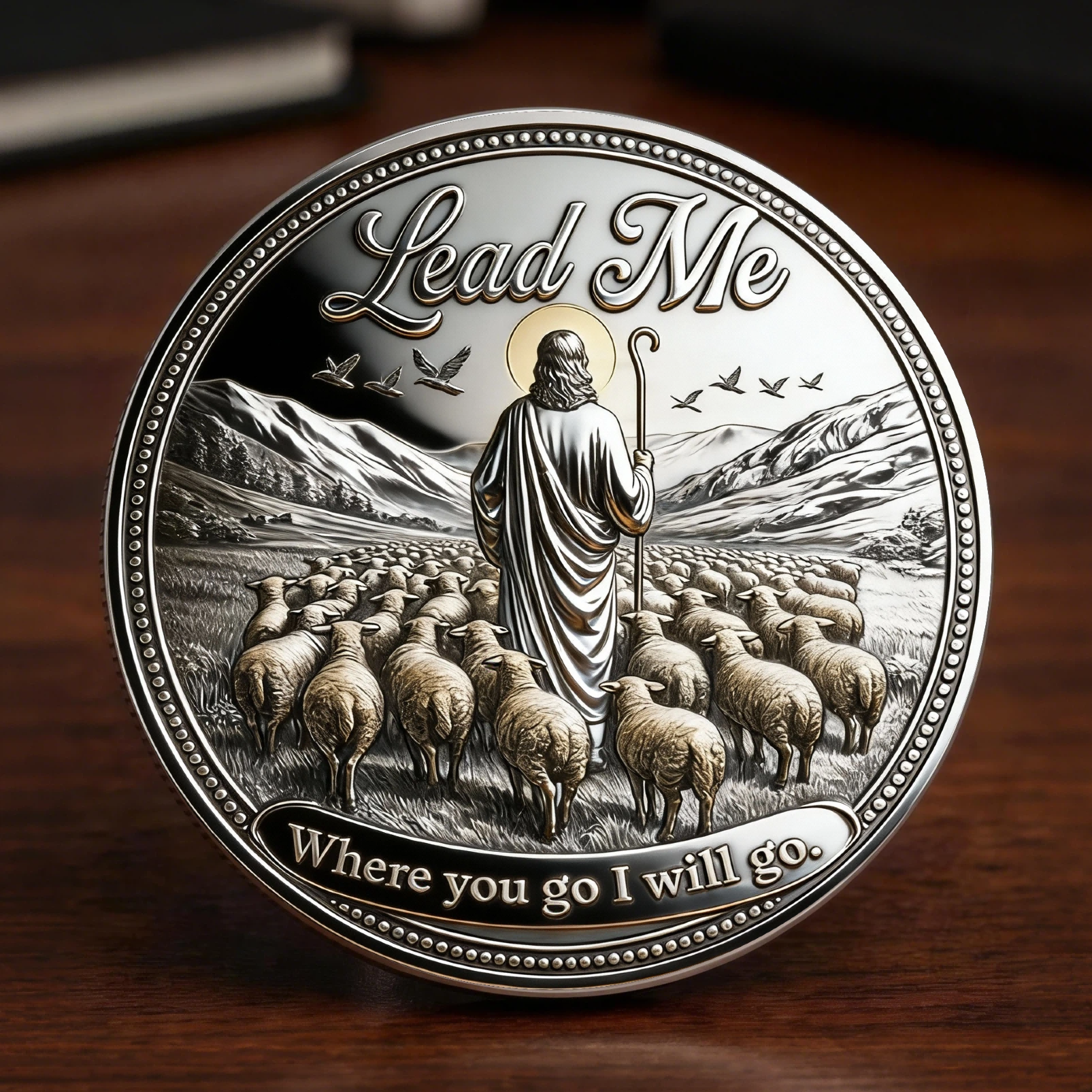 Inspired by Psalm 23, this beautifully designed commemorative coin tells a powerful story of divine presence, protection, and guidance. Every element speaks to trust in the Shepherd who walks with us through every valley and leads us forward with love.